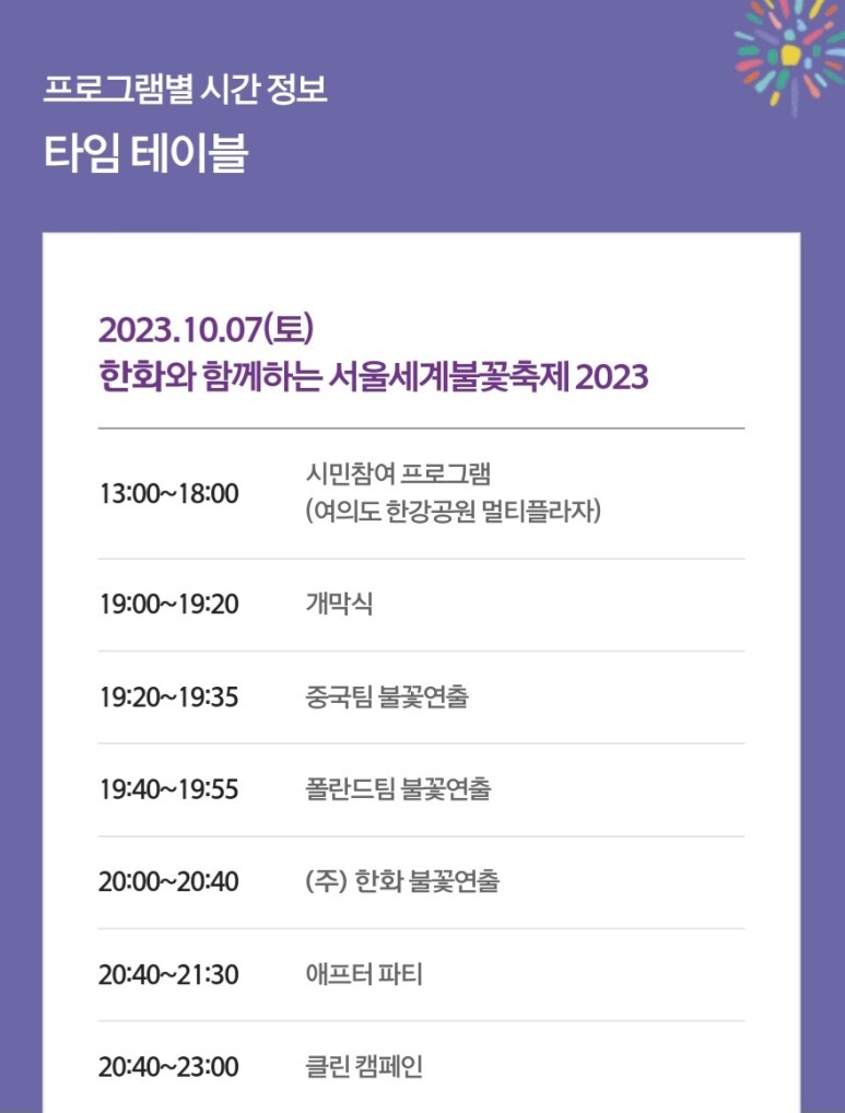여의도 불꽃축제는 매년 가을 서울 여의도에서 열리는 세계적인 불꽃축제로, 세계 각국의 불꽃 전문가들이 참여해 화려한 불꽃을 선보입니다. 불꽃축제가 열리는 날에는 수많은 사람들이 여의도 한강공원에 모여 불꽃을 감상하며 즐거운 시간을 보냅니다.